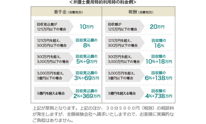 自動車保険や火災保険、医療保険などには、「弁護士費用特約」と呼ばれる特約が付いている場合があります。これは、保険会社があなたのかわりに弁護士費用を負担してくれる特約です。その補償内容、条件などはその保険によって異なりますが、ほとんどの保険会社は300万円まで補償する内容となっています。これは、相当高額な賠償金の場合でないかぎり、全額補償される金額です。